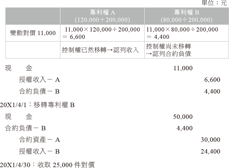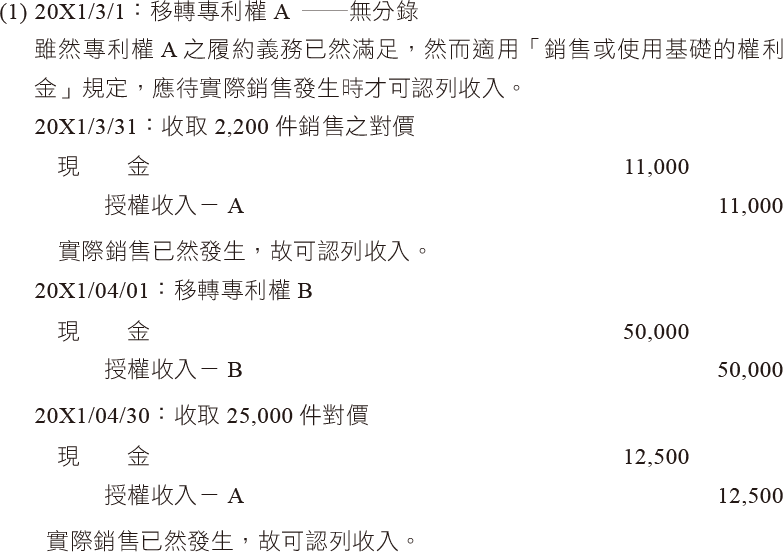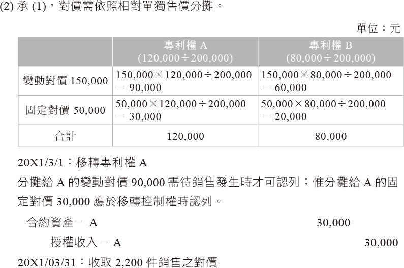 - 甲公司與乙客戶於20X1年3月1日簽訂專利權A與專利權B之授權合約,將分別於20X1年3月1日與4月1日移轉專利權A與專利權B之授權給乙客戶。甲公司係依乙客戶在20X1年3月至12月間以專利權A生產的產品數量,每件收取$5,作為移轉專利權A授權之價金;專利權B之授權則索價$50,000。於20X1年3月1日甲公司估計因乙客戶使用專利權A而致甲公司有權可收取之變動價金高度很有可能為$150,000。