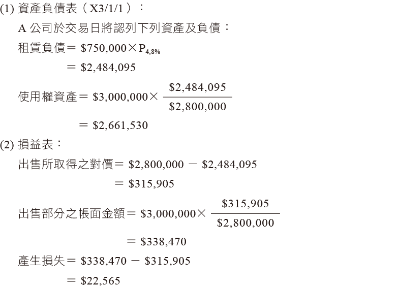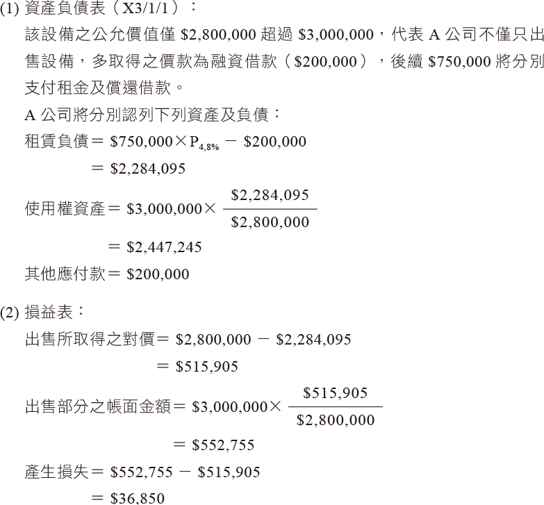 - A公司於X3年初將一部帳面金額$3,000,000之設備出租予B公司,並立即租回使用,租期4年,B公司應於每年年底支付租金$750,000給A公司,並於租期屆滿後歸還予A公司。A公司之租賃隱含利率為8%,且該出租設備係以公允價值$2,800,000出售。